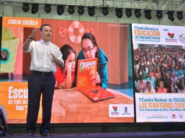 El alcalde de Medellín, Aníbal Gaviria Correa, presentó el 8 de octubre ante los docentes que participan en la primera Cumbre Nacional de Educación: "Los Territorios Cuentan", que se realiza en Plaza Mayor, su ponencia "Medellín, Ciudad Escuela".
