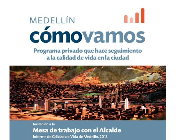 Medellín Cómo Vamos lo invita de manera muy especial a participar de la "Mesa de Trabajo con el Alcalde, Informe de Calidad de vida de Medellín, 2013", el viernes, 13 de junio de 2014, en el auditorio de la Cámara de Comercio de Medellín para Antioquia, sede El Poblado (Cra. 44 16 Sur 170), entre las 9.00 a.m. y las 12.00 m., en el que se presentará el Informe de Calidad de vida, 2013.