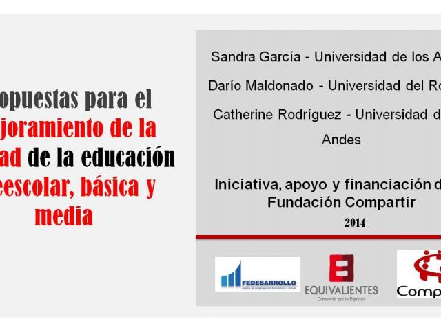 Fedesarrollo, Equivalientes y Fundación Compartir presentan la investigación "Propuestas para el mejoramiento de la calidad de la educación preescolar, básica y media", con el apoyo de los investigadores Sandra García y Catherine Rodríguezde la Universidad de los Andes y Darío Maldonado de la Universidad del Rosario.
