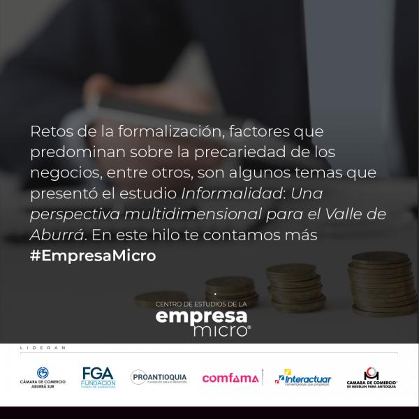 “Es importante entenderlas (a las microempresas) y conocer su dinámica: la mayoría de las micros que se crean están basadas en conocimiento, servicios y tecnología, y debemos conocerlas para mayor pertinencia de los programas de política pública y contribuir a su formalización, pues se estima que 50 % de ellas son informales y no acceden a cajas de compensación, pensiones, entre otros.” Jaime Echeverri, vicepresidente de Planeación y Desarrollo de la Cámara de Comercio de Medellín.