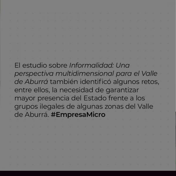 El estudio "Informalidad: una perspectiva multidimensional para el Valle de Aburrá" identificó, entre otros retos, la necesidad de garantizar mayor presencia del Estado frente a los grupos ilegales de algunas zonas del Valle de Aburrá.