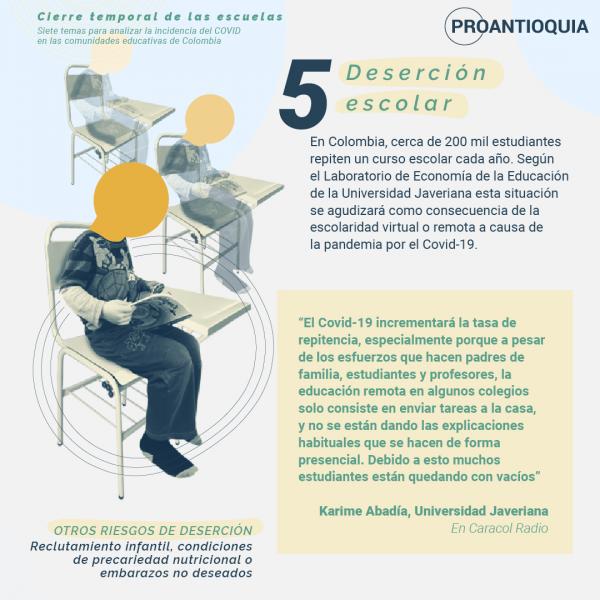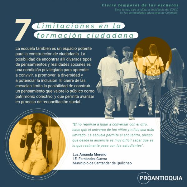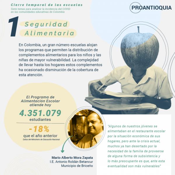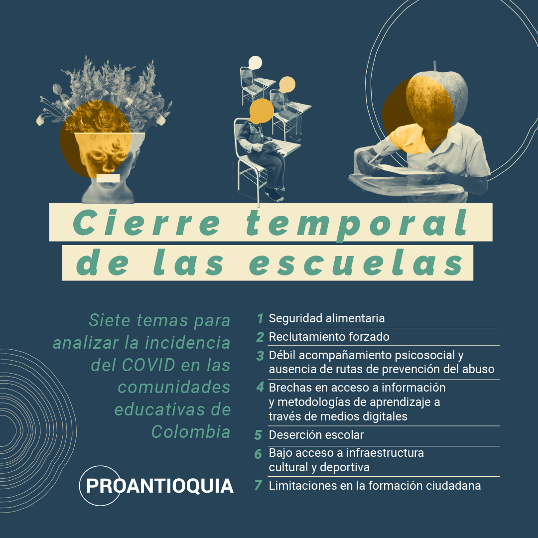 A continuación, podrán ver siete temas que han surgido por cuenta del cierre temporal de las escuelas en el marco de la pandemia. Queda una importante tarea: trabajar de manera conjunta para resolver el mayor número de aspectos negativos que evidenció este cierre y que podrán ayudar a que nuestros niños, niñas y adolescentes crezcan con unas garantías que todo Estado debe cumplir.