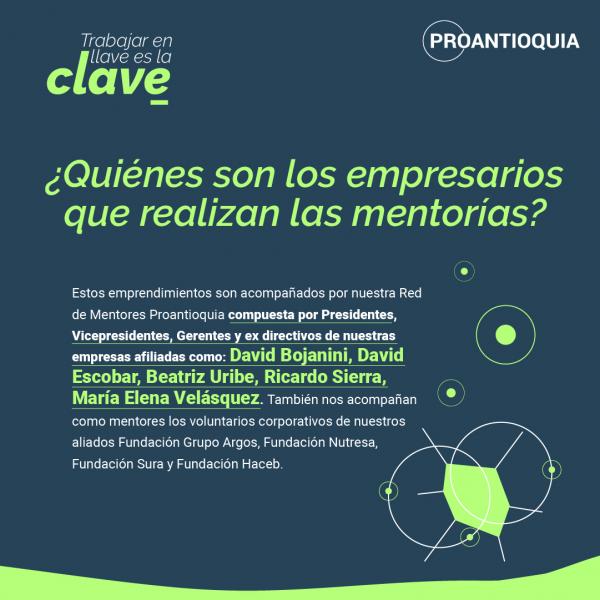 El trabajo en equipo siempre traerá mejores resultados para el desarrollo de la región. Una de las motivaciones que tenemos en Proantioquia es la construcción de relaciones entre los empresarios nuevos con los más experimentados. Para compartir conocimientos y acompañar el nacimiento de nuevas empresas que generen empleo y aumenten el bienestar de la región creamos las Mentorías empresariales, un programa en el que líderes empresariales asesoran a emprendedores y los ayudan a llevar sus proyectos a un nivel empresarial con aporta valor a la sociedad.