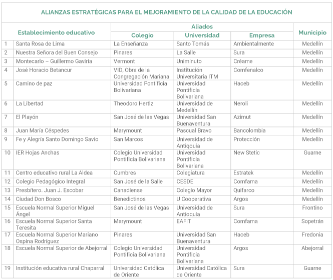 De acuerdo con lo anterior, una manera concreta de acompañar el sector educativo es a través de la promoción y coordinación de las Alianzas estratégicas para el mejoramiento de la calidad de la educación. Esta estrategia es un modelo de cooperación público-privado en la cual una universidad, un colegio privado y una empresa, acompañan de manera ad honorem el mejoramiento de la gestión escolar en instituciones educativas oficiales y su propósito central es fortalecer la gestión escolar a través de procesos de formación, transferencia y gestión de buenas prácticas y de conocimiento.