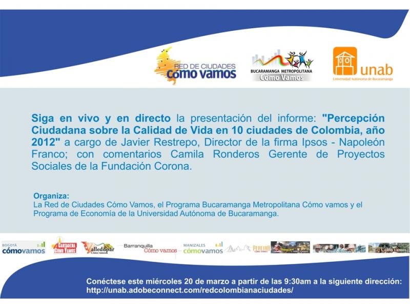 Conéctese este miércoles 20 de marzo de 2013, a partir de las 9:30 am a la siguiente dirección: http://unab.adobeconnect.com/redcolombianaciudades/.
