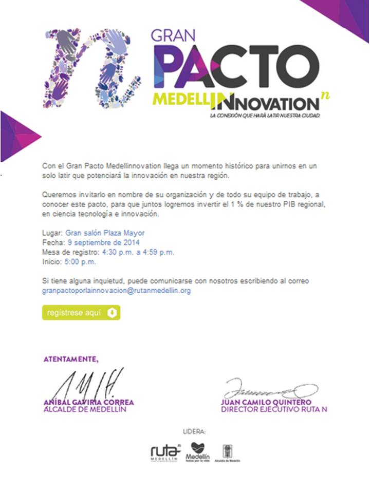 La Alcaldía de Medellín y Ruta N invitan al sector público y educativo así como los empresarios y ciudadanos a firmar el Gran Pacto Medellinnovation, que llega en un momento histórico para unirnos en un solo latir que potenciará la innovación en nuestra región, para que juntos logremos invertir el 1 % de nuestro PIB regional, en ciencia tecnología e innovación.