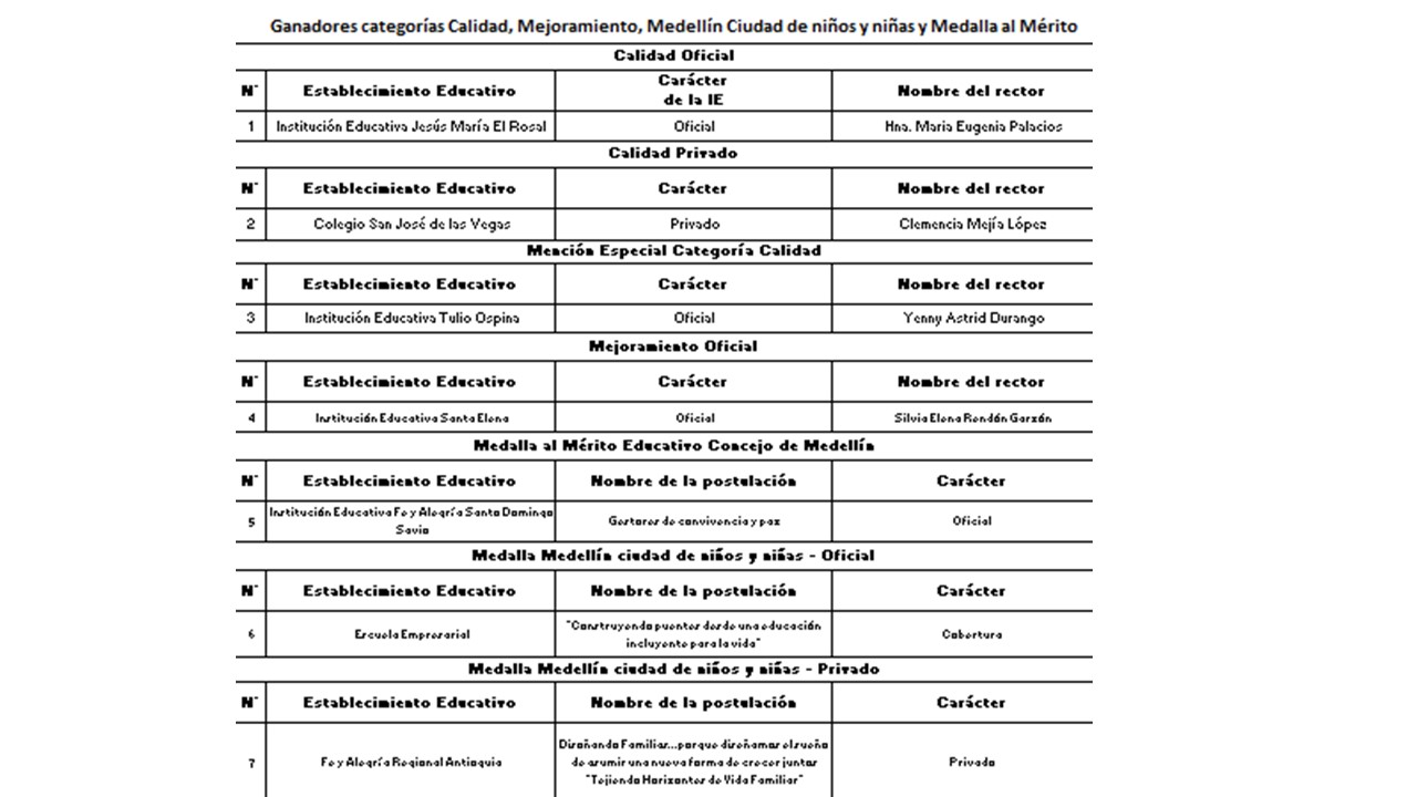 Conozca a las instituciones ganadoras 2015 en el Premio ciudad de Medellín a la Calidad de la Eduación. Ellos son ganadores en las categorías Calidad, Mejoramiento, Medellín Ciudad de niños y niñas y Medalla al Mérito.