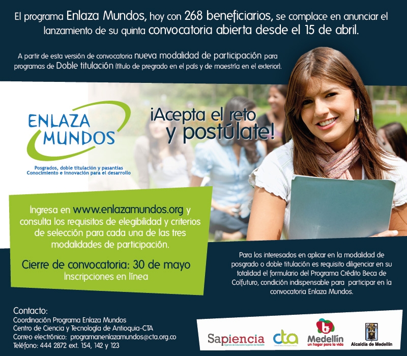El Programa Enlaza Mundos, hoy con 268 beneficiarios, lanzó desde el 15 de abril de 2013 su quinta convocatoria. En esta oportunidad la convocatoria 2013 se abre en tres modalidades: POSGRADO (MAESTRÍA-DOCTORADO), DOBLE TITULACIÓN Y PASANTÍAS. El cierre de la convocatoria será el 30 de mayo de 2013.