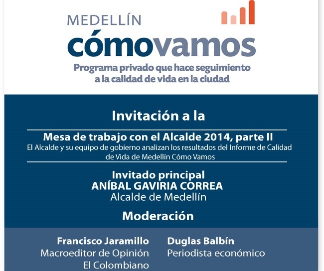 Este viernes 18 de julio el Alcalde de Medellín, Aníbal Gaviria y su equipo de gobierno analizarán los resultados del Informe de Calidad de Vida de Medellín 2013, realizado por el programa Medellín Cómo Vamos. En esta segunda Mesa de trabajo del año, el Alcalde será el invitado principal, acompañado de los moderadores Francisco Jaramillo, Macroeditor de opinión del periódico El Colombiano y Duglas Balvín, periodista económico.