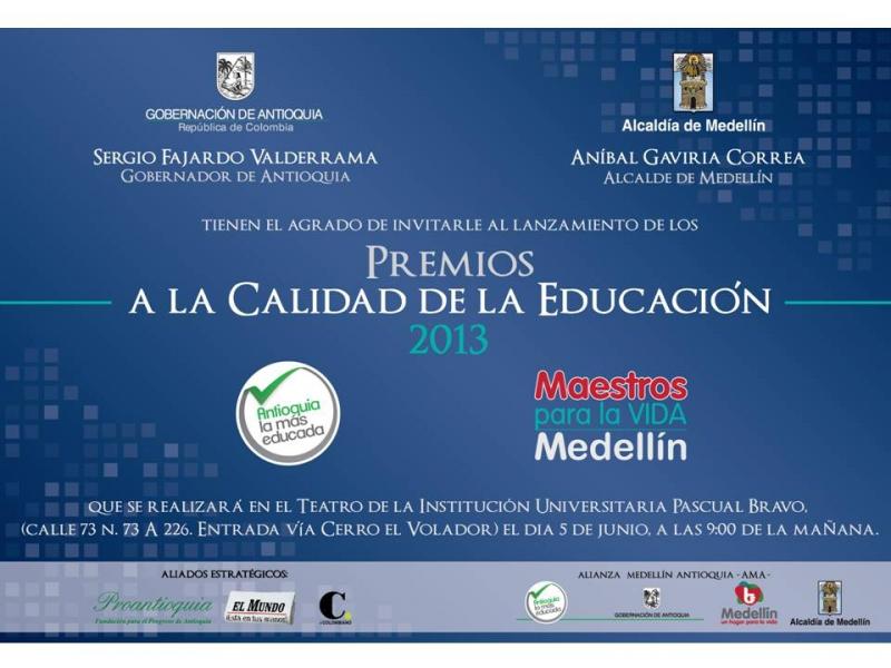 La Alcaldía de Medellín y la Gobernación de Antioquia tienen el gusto de invitar a la comunidad educativa y los ciudadanos al Lanzamiento de los Premios a la Calidad de la Educación 2013 "Maestros para la Vida Medellín" y "Antioquia la Más Educada", que se realizará el miércoles 5 de junio, a las 9:00 a.m., en el Teatro de la Institución Universitaria Pascual Bravo (Calle 73 No. 73 A 226) en Medellín.