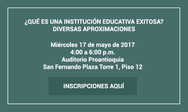 ¿Qué es una Institución Educativa exitosa? Esta será la pregunta que abordaremos el próximo miércoles 17 de mayo, a las 4:00 pm, en el Auditorio de Proantioquia, junto a importantes invitados del sector académico y público. Los esperamos para que juntos construyamos insumos de conocimiento que puedan ser de utilidad en la región. Inscripciones aquí