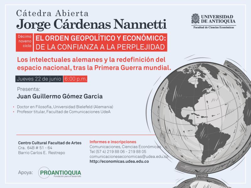 "Para generar reflexión frente a los cambios y perspectivas del orden económico y geopolítico actual, en donde resurgen ideas similares a las que tuvieron fuerza durante los nacionalismos de la primera mitad del siglo XX, la cátedra Jorge Cárdenas Nannetti trae la conferencia “Los intelectuales alemanes y la redefinición del espacio nacional, tras la Primera Guerra mundial”, a cargo de Juan Guillermo Gómez, profesor titular de la Facultad de Comunicaciones de la Universidad de Antioquia.