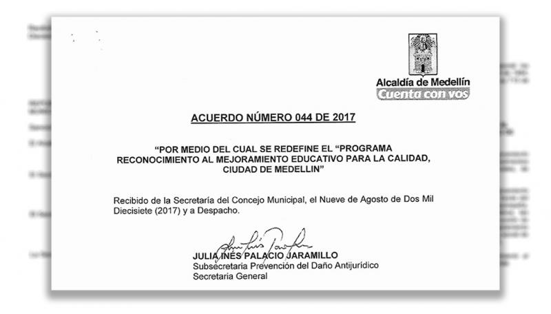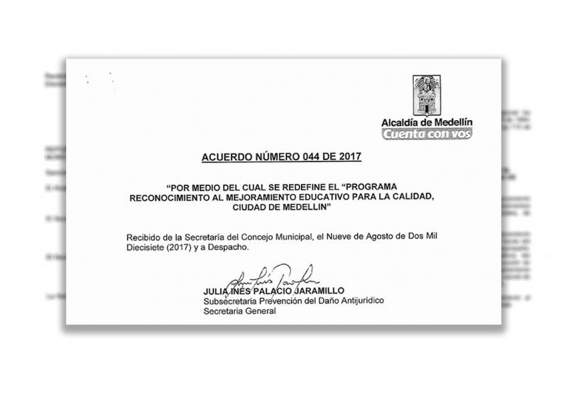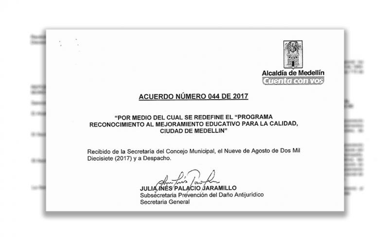 "Con la aprobación por parte del Concejo Municipal del Proyecto de Acuerdo 095 de 2017, por medio del cual se redefine el Programa Reconocimiento al Mejoramiento Educativo para la Calidad, Ciudad de Medellín, se consolida la política pública educativa como el eje y motor de desarrollo de la ciudad"