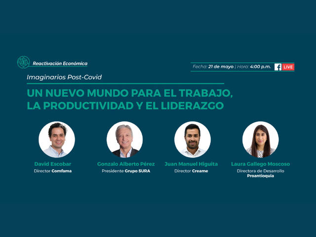 ¿Cuáles son los principales desafíos en el mercado laboral del futuro y las transformaciones que serán definitivas en la gestión del talento humano, el liderazgo en nuestras organizaciones y la cultura organizacional? Conversan Gonzalo Pérez, Presidente de Grupo Sura, David Escobar, Director de Comfama y Juan Manuel Higuita, Director de Creame con Laura Gallego, Directora de Desarrollo de Proantioquia.