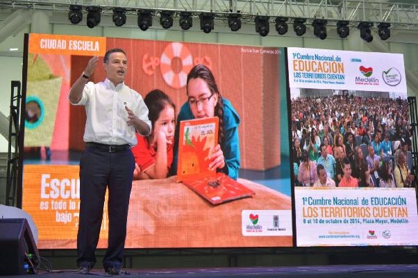 El alcalde de Medellín, Aníbal Gaviria Correa, presentó el 8 de octubre ante los docentes que participan en la primera Cumbre Nacional de Educación: "Los Territorios Cuentan", que se realiza en Plaza Mayor, su ponencia "Medellín, Ciudad Escuela".