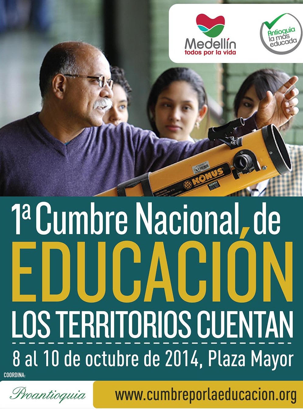 La Alcaldía de Medellín, la Gobernación de Antioquia y Proantioquia, realizarán la Primera Cumbre Nacional de la Educación, los territorios cuentan, evento que tendrá lugar del 8 al 10 de octubre en Plaza Mayor.