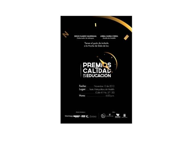 El Gobernador de Antioquia, Sergio Valderrama y el Alcalde de Medellín, Aníbal Gaviria tienen el gusto de invitarlos a la Noche de Gala de los Premios a la Calidad de la Educación, el 13 de noviembre de 2013, en el Teatro Metropolitano, a las 6 pm. Para ingresa re requiere invotación física.