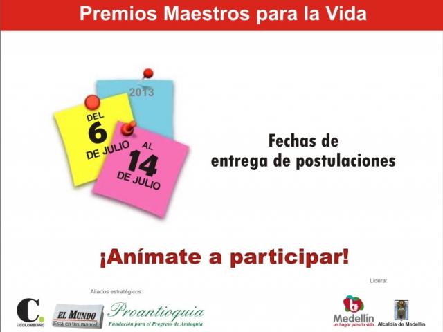 Del 6 al 14 de julio de 2013 los docentes de la ciudad de Medellín podrán postularse a los Premios Maestros para la Vida, liderados por la Alcaldía de Medellín, por medio de su Secretaría de Educación, y en alianza con El Colombiano, El Mundo y Proantioquia.
