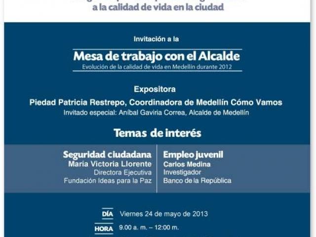El viernes 24 de mayo, de 9:00 am a 12:00 m, se llevará a cabo la Mesa de trabajo con el Alcalde "Evolución de la calidad de vida en Medellín durante 2012", que tendrá como invitado especial al doctor Aníbal Gaviria Correa, Alcalde de Medellín y como expositora a la doctora Piedad Patricia Restrepo, Coordinadora de Medellín Cómo Vamos.