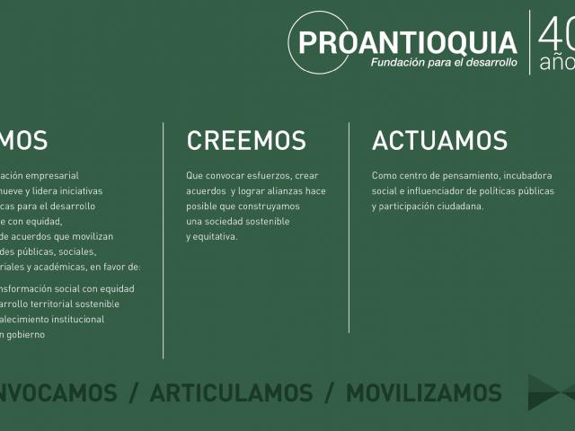 Proantioquia nace el 1 de julio de 1975, como una respuesta anticipada a la necesidad de discutir, analizar, valorar y apoyar, desde el sector privado, políticas públicas de carácter regional y nacional. Según los estatutos, la finalidad de la organización es: