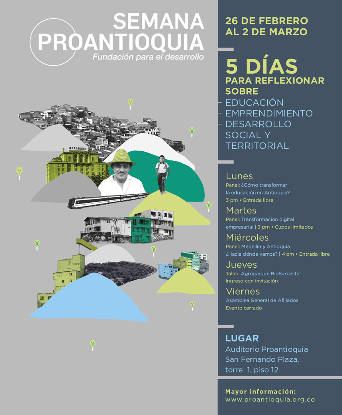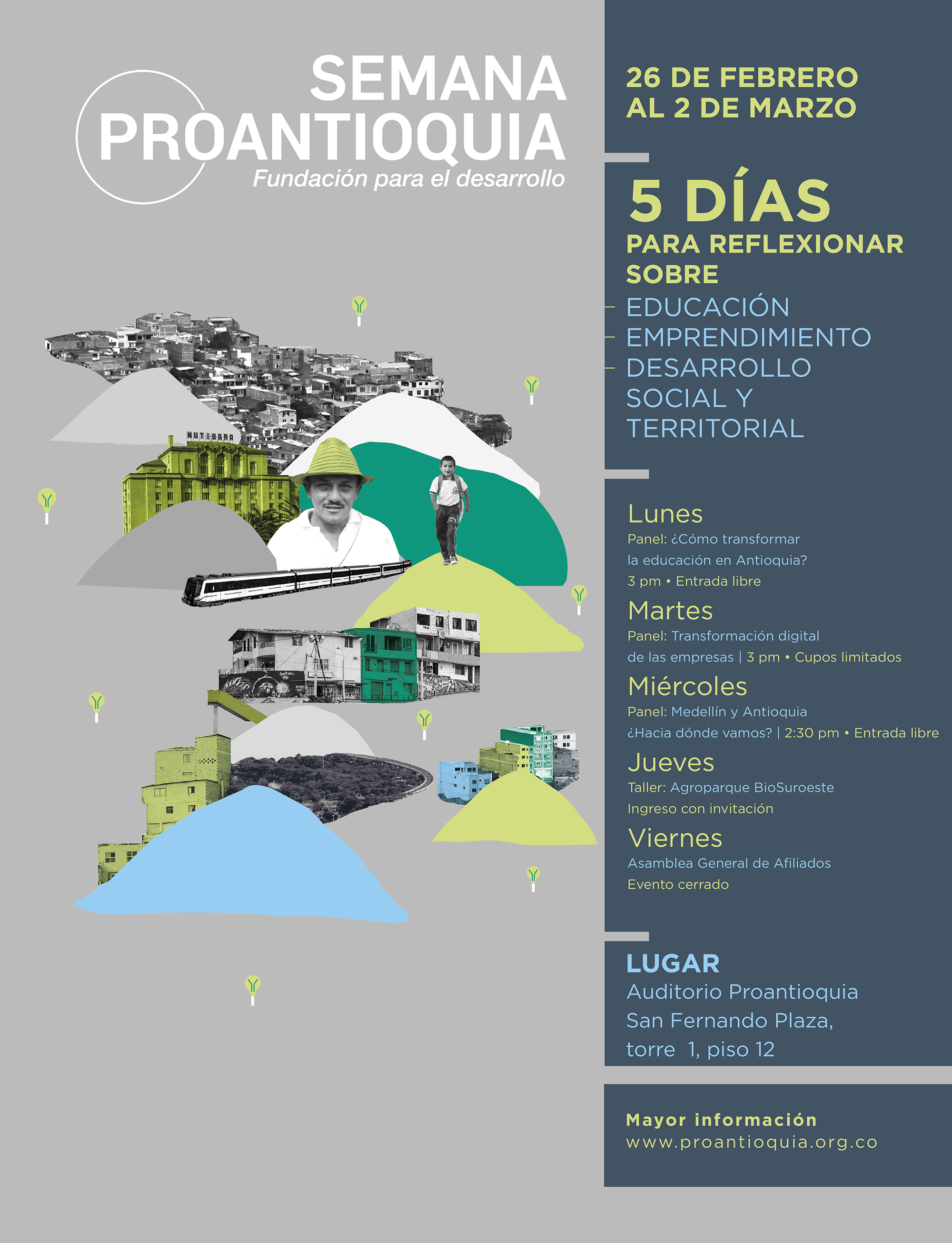 Del 26 de febrero al 2 de marzo realizaremos la Semana Proantioquia, cinco días para reflexionar sobre algunos de los temas que marcan los grandes desafíos para nuestra sociedad: calidad de la educación, transformación digital de las empresas y las grandes oportunidades que tenemos en innovación y tecnología para el agro.