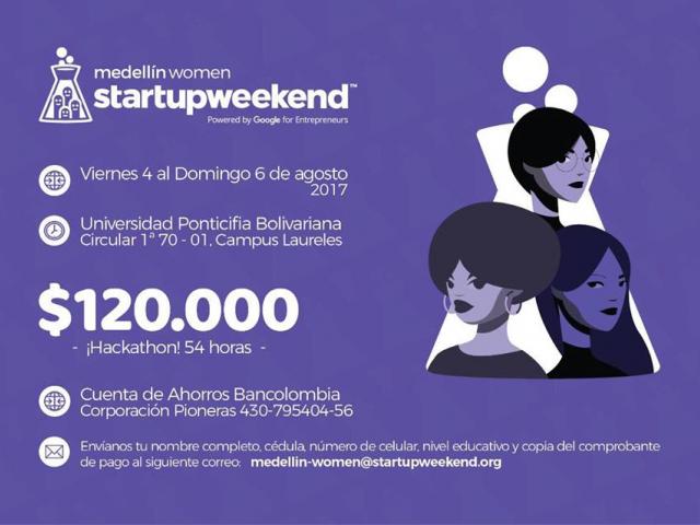 Del 4 al 6 de agosto en Medellín y patrocinado por Google, será el evento Startup Weekend, Women's Edition, que empodera y forma a nuevas lideres emprendedoras de la región. Dirigido a mujeres interesadas en cerrar la brecha de género en la industria tecnológica. Los hombres también pueden participar, acompañados por una de ellas.