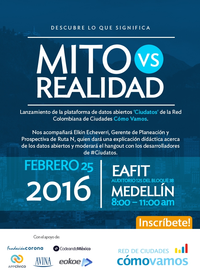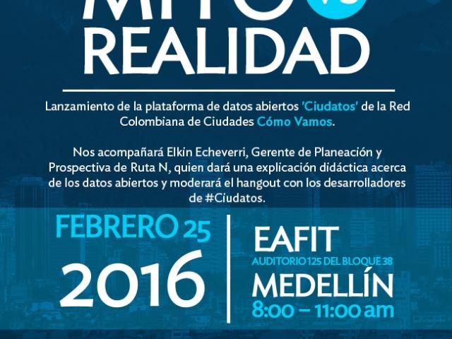 La Red Colombiana de Ciudades Cómo Vamos presentará este próximo 25 de febrero en la Universidad Eafit de Medellín, CIUDATOS, la primera plataforma de datos abiertos desarrollada desde la sociedad civil en Colombia. El evento se realizará en el auditorio 125, bloque 38 de la universidad y tendrá una presentació