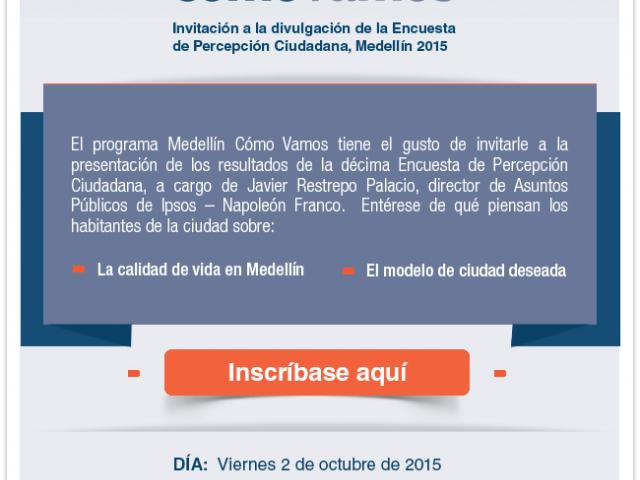 El 2 de octubre, a las 9 am, se realizará la Décima Encuesta de Percepción Ciudadana del programa Medellín Cómo Vamos, apoyado por Proantioquia. El evento tendrá lugar en la Cámara de Comercio de Medellín para Antioquia, sede centro.