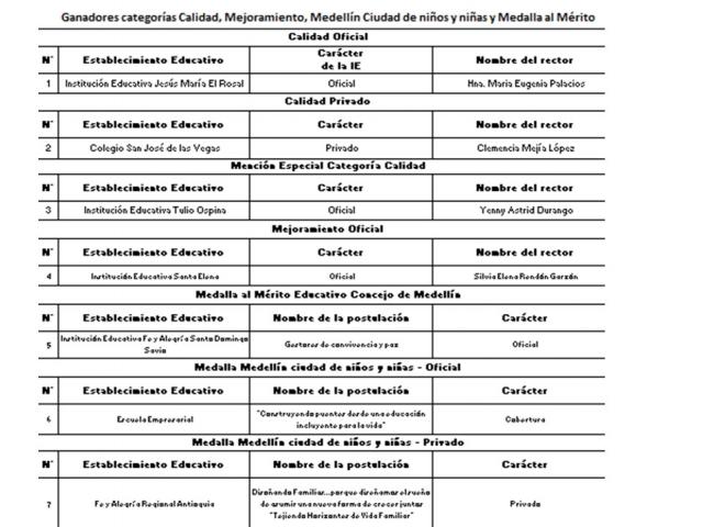 Conozca a las instituciones ganadoras 2015 en el Premio ciudad de Medellín a la Calidad de la Eduación. Ellos son ganadores en las categorías Calidad, Mejoramiento, Medellín Ciudad de niños y niñas y Medalla al Mérito.