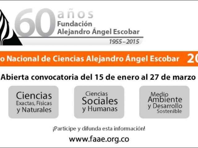La FUNDACIÓN ALEJANDRO ÁNGEL ESCOBAR invita a participar en la convocatoria para los Premios Nacionales de CIENCIAS Y SOLIDARIDAD. Le recordamos a la comunidad científica colombiana y a las entidades que trabajen en beneficio de la comunidad, que la convocatoria de 2015 se cierra este 27 de marzo.