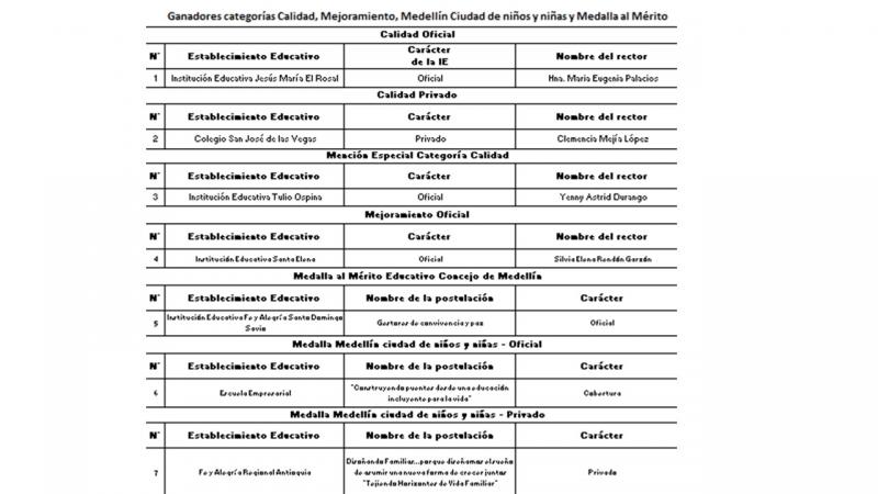 Conozca a las instituciones ganadoras 2015 en el Premio ciudad de Medellín a la Calidad de la Eduación. Ellos son ganadores en las categorías Calidad, Mejoramiento, Medellín Ciudad de niños y niñas y Medalla al Mérito.
