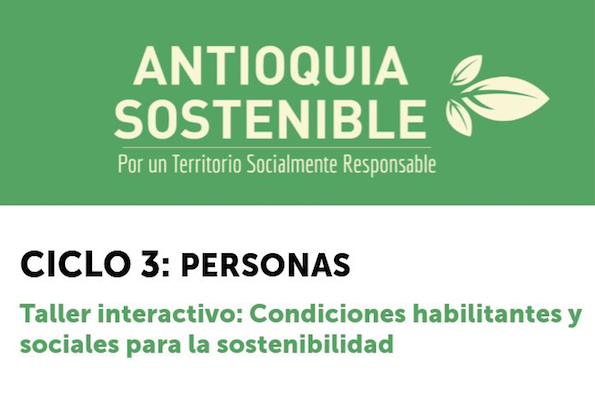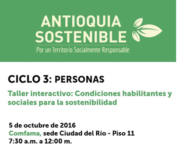 Este miércoles 5 de octubre, se cumplirá el taller interactivo: condiciones habilitantes y sociales para la sostenibilidad, como parte del ciclo 3 de Antioquia Sostenible. El encuentro será en las instalaciones de Comfama, en Ciudad del Río, a las 7:30 de la mañana. Inscripciones aquí.