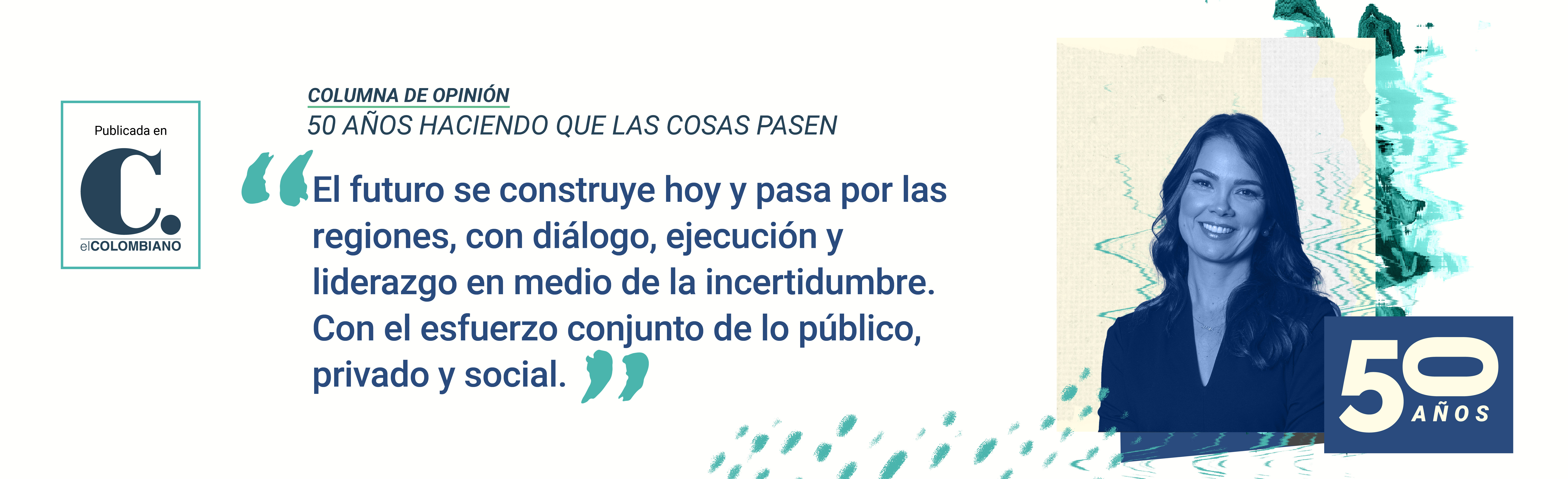 El futuro se construye hoy y pasa por las regiones, con diálogo, ejecución y liderazgo en medio de la incertidumbre. Con el esfuerzo conjunto de lo público, privado y social. Con instituciones y líderes que venzan el silencio y la indiferencia. Con un propósito común que transcienda la división. En Proantioquia estamos listos para 50 años más, haciendo que las cosas pasen.